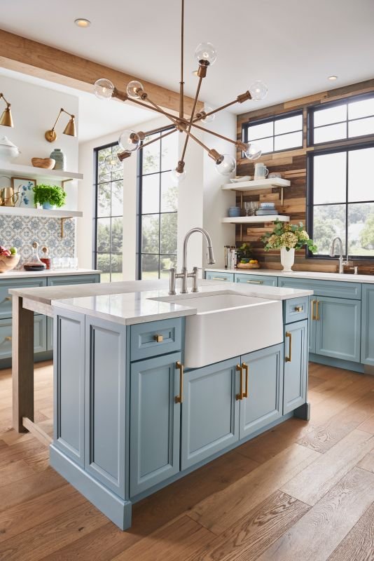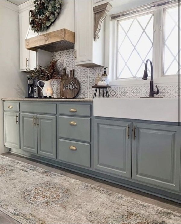 If you’re feeling bold, experiment with different shades of blue like robin’s egg blue or teal for your upper cabinets paired with a classic navy on the lower ones. This variation adds dimension and personality without overwhelming the space.