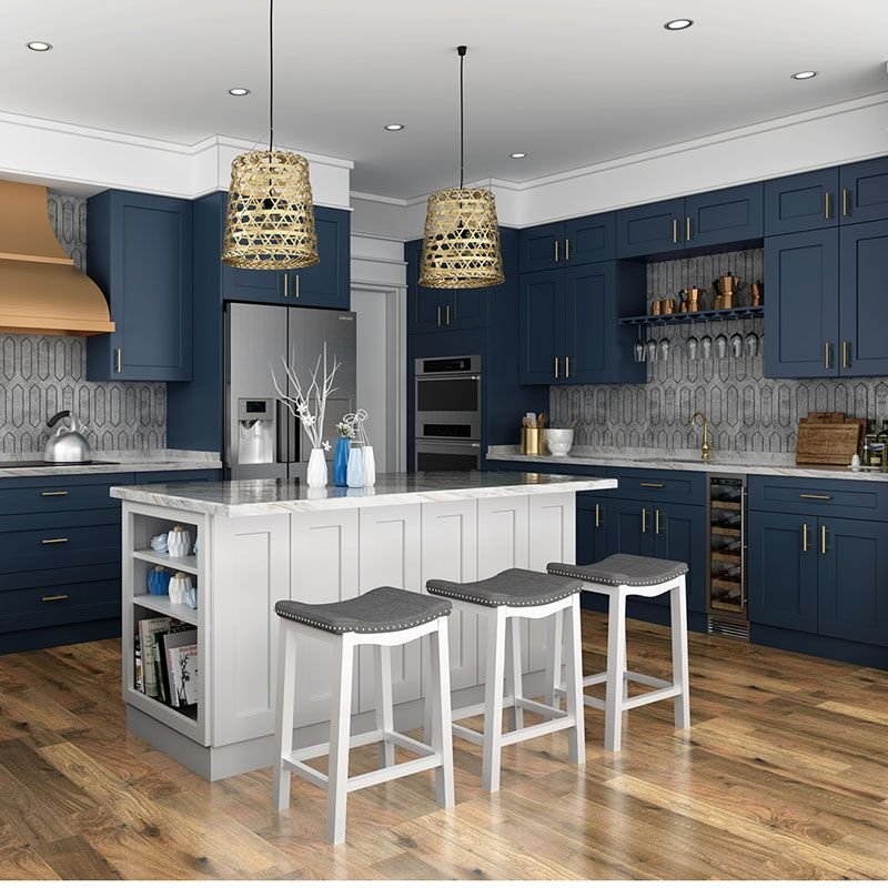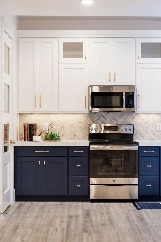 Imagine bright white upper cabinets, creating an airy and open feel in your kitchen space. Paired with deep navy blue lower cabinets, this duo adds depth and richness that exudes timeless elegance. The contrast between the light and dark tones brings balance and visual interest.
